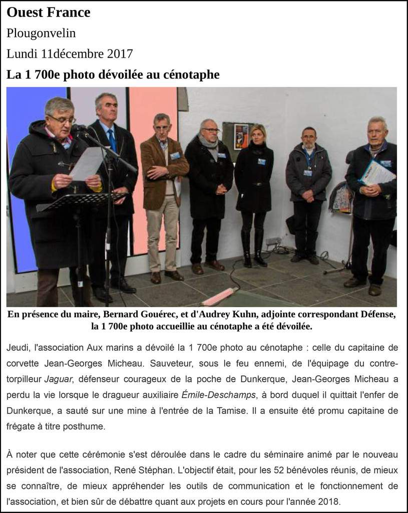 La photographie de Jean-Georges Micheau, marin mort pour la France, qui est la 1700ème apposée au cénotaphe, a été dévoilée le jeudi 7 décembre 2017.
